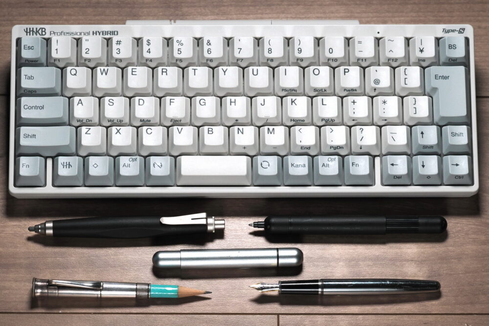 自分は筆記具に限らず、身の回りで使う道具には徹底した機能美を求める。タクタ氏が目の前に置いたキーボード、Happy Hacking Keyboad(HHKB)の「Type-S」はまさに機能美の極地。形に無駄がない。自分が日々編集部で愛用しているREALFORCEのキーボードにも似ている。HHKBの手前に自分が愛用しているペンを並べてみたが、佇まいの雰囲気もとても似ている。