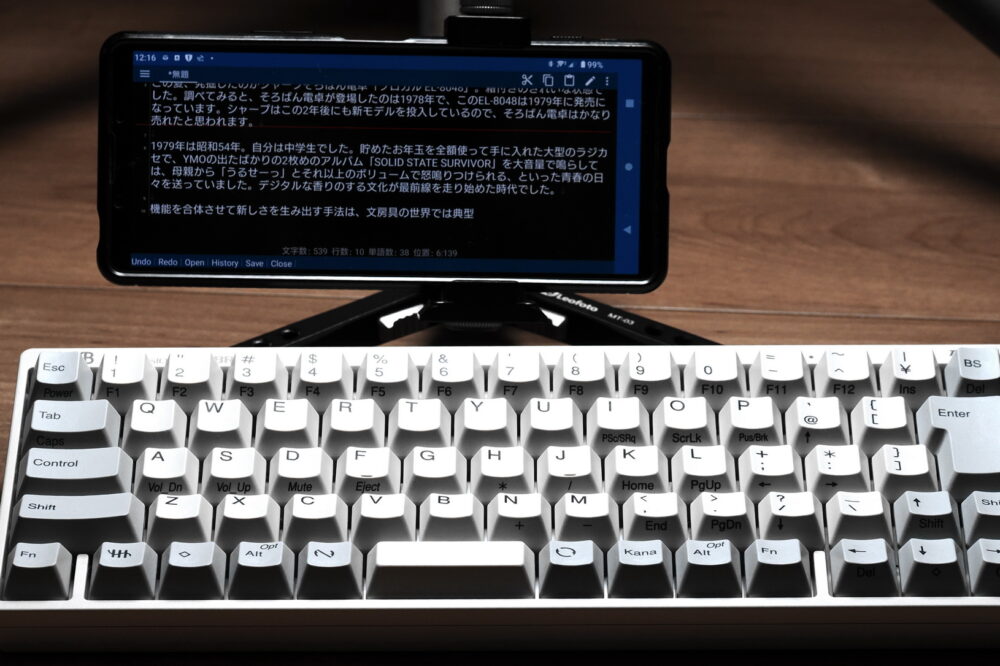 HHKBは携帯しやすいので、ぜひスマホで活用したい。スマホの文字入力には、日頃からかなりのストレスを溜めている。つるつるしたガラス板を押すという行為自体が生理的に苦手ということもあり、メールの返信でもメモでも最大で10文字くらいのが限界なのだ。スマホをLeofotoの小型三脚に固定し、HHKBのすぐ上に配置し自由雲台で液晶の角度を微調整したら、シンプルかつ理想的な入力環境が完成。スマホでも、ずーっと書き続けたい「打ち味」が体感できた。